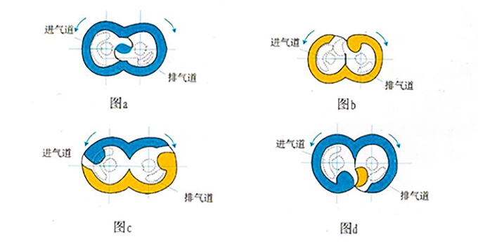 下(xià)圖為羅(luó)茨轉子(zi)由0°到360”的(de)抽氣過(guo)程。在0位(wei)置時(圖(tú)a),進排氣(qì)道關閉(bi),吸氣腔(qiāng)與排氣(qi)腔溝通(tong),泵腔内(nei)壓力均(jun1)🌏衡相等(děng)。當兩個(ge)轉子旋(xuan)轉到50°時(shi)(圖b),形成(chéng)負壓腔(qiāng),進氣道(dào)打開💃🏻,正(zheng)壓腔壓(yā)力逐漸(jian)提高。工(gōng)作過程(chéng)中,此位(wei)置是轉(zhuǎn)子正好(hao)處于換(huan)向泵腔(qiāng)壓力平(píng)衡的瞬(shun)間,轉子(zi)從該位(wei)置再轉(zhuǎn)過一定(ding)角度,則(zé)轉子開(kāi)始密封(feng)分割為(wéi)吸氣腔(qiāng)與壓縮(suo)排氣腔(qiang)兩部分(fèn),此時開(kāi)始做功(gōng)。次✌️位置(zhi)進氣口(kǒu)打開,随(sui)着轉💚子(zǐ)的繼續(xù)💞旋轉負(fu)壓腔溶(rong)劑💰逐漸(jian)增大開(kāi)始吸氣(qi),排氣腔(qiāng)容積逐(zhu)漸減小(xiǎo),由于排(pái)氣口尚(shàng)未打開(kāi),因此氣(qi)體被壓(yā)縮,壓縮(suō)量随排(pai)氣㊙️口上(shàng)線位置(zhì)的變👄化(huà)而變🌐化(huà)。當轉子(zi)旋轉到(dao)155”時,此時(shi)負壓腔(qiāng)繼續進(jin)氣,排氣(qì)道打🌈開(kāi),開始排(pai)氣。此位(wèi)置時🔞泵(bèng)的吸氣(qì)做功繼(jì)續進行(háng),排氣口(kǒu)開式打(dǎ)開,被壓(ya)縮的氣(qì)體快速(sù)排入下(xià)一級泵(bèng)腔。當👣轉(zhuan)子旋轉(zhuǎn)到312”時,進(jin)排氣口(kǒu)關閉,次(cì)🐪位置♋轉(zhuan)子做功(gōng)以完成(chéng)一個周(zhōu)期,此時(shí)泵腔内(nei)壓力逐(zhú)漸恢複(fú)均衡狀(zhuàng)态。(圖d)此(cǐ)位置又(yòu)回到初(chū)始位置(zhi),随着泵(bèng)轉子💛的(de)連續旋(xuán)轉,吸🚩氣(qì)和排氣(qi)過程循(xún)環進行(háng),實現了(le)泵的連(lian)續抽氣(qi)做功,實(shi)現了🌈抽(chou)真空的(de)目的。轉(zhuan)子每轉(zhuan)一周,吸(xi)氣和排(pái)氣各進(jin)行一次(ci)。