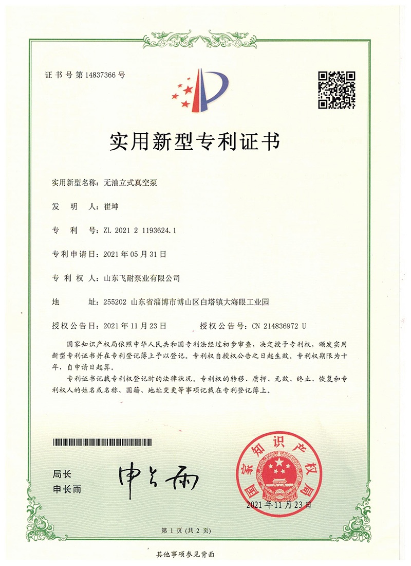 無(wú)油立式(shi)真空泵(beng)專利證(zheng)書