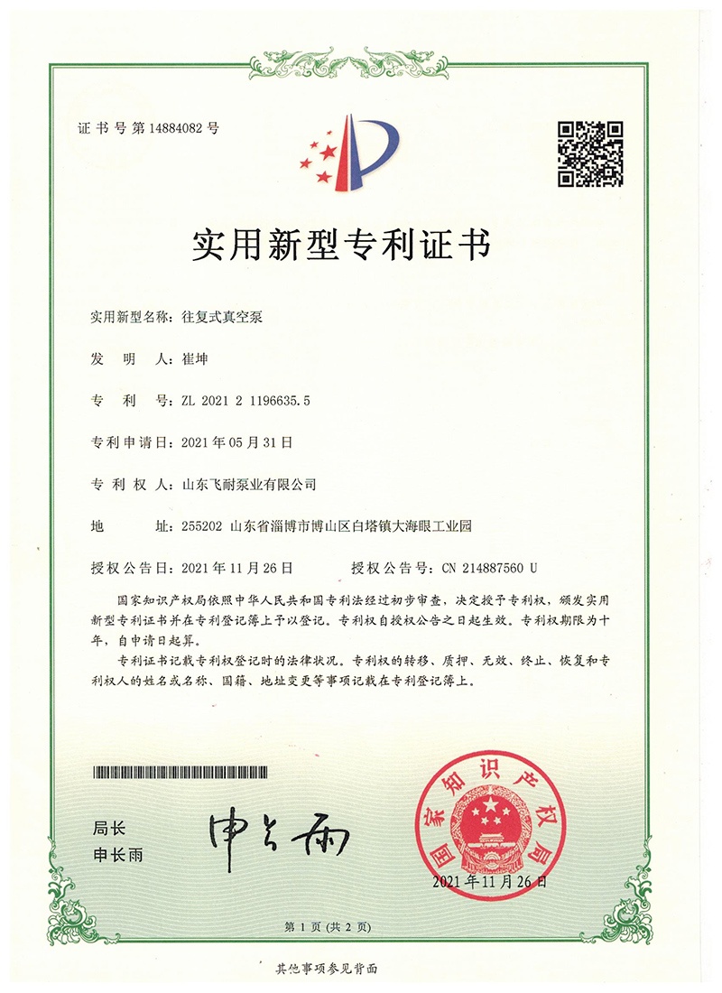 往複式(shi)真空泵(beng)專利證(zheng)書